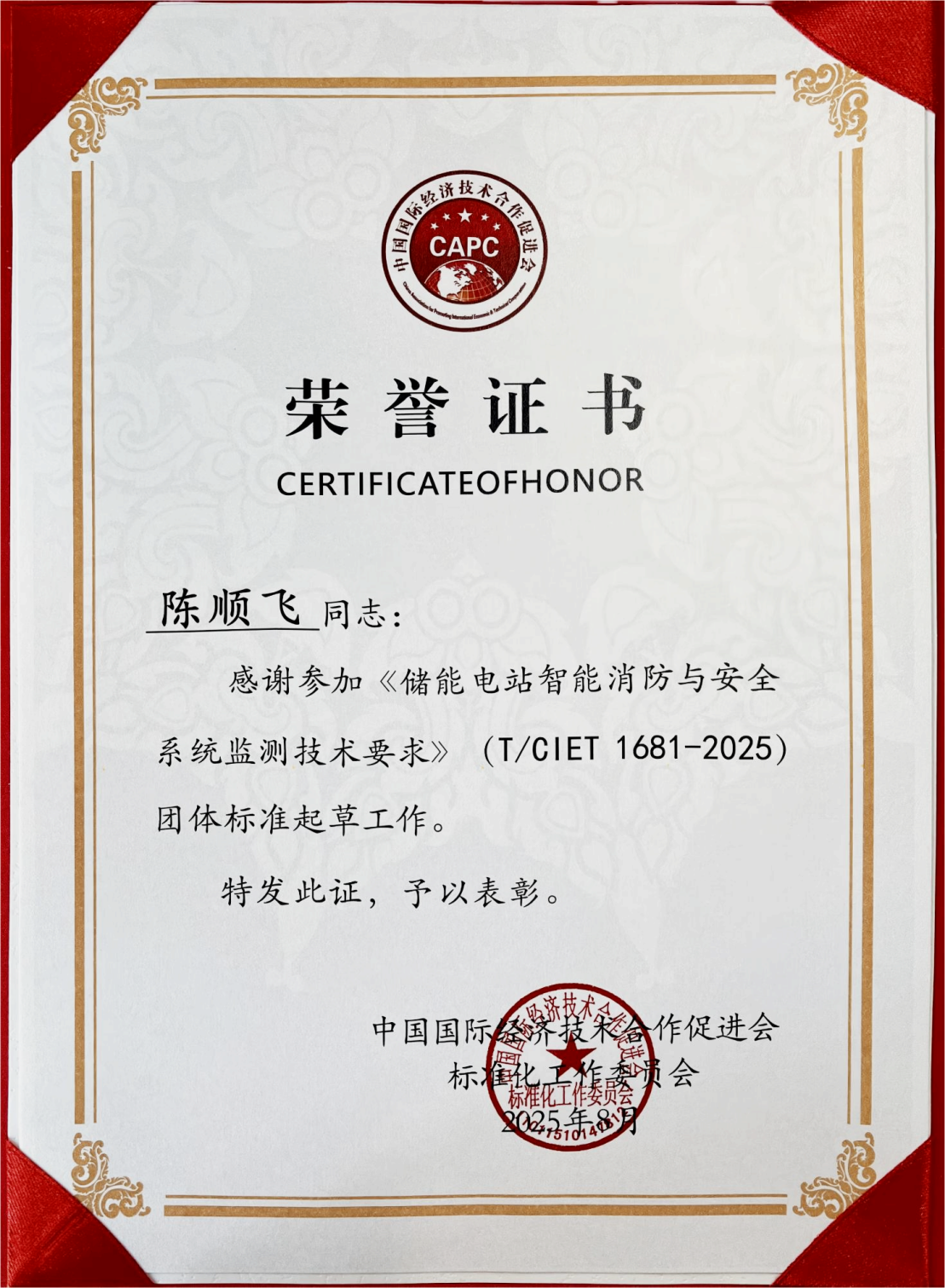 近年来,随着“双碳”战略的纵深推进,储能产业驶入“快车道”。然而,储能电站在高能量密度、高功率运行场景下,火灾与安全事故风险日益凸显,行业亟需一套科学、统一、可落地的智能消防与安全监测“标尺”。近日,由湖南慧明谦数字能源技术有限公司(以下简称“慧明谦”)汪文红、陈顺飞两位专家深度参与起草的《储能电站智能消防与安全系统监测技术要求》团体标准正式发布;同时,两位专家荣获标准起草“荣誉证书”,为公司在储能安全领域再添一枚“军功章”。