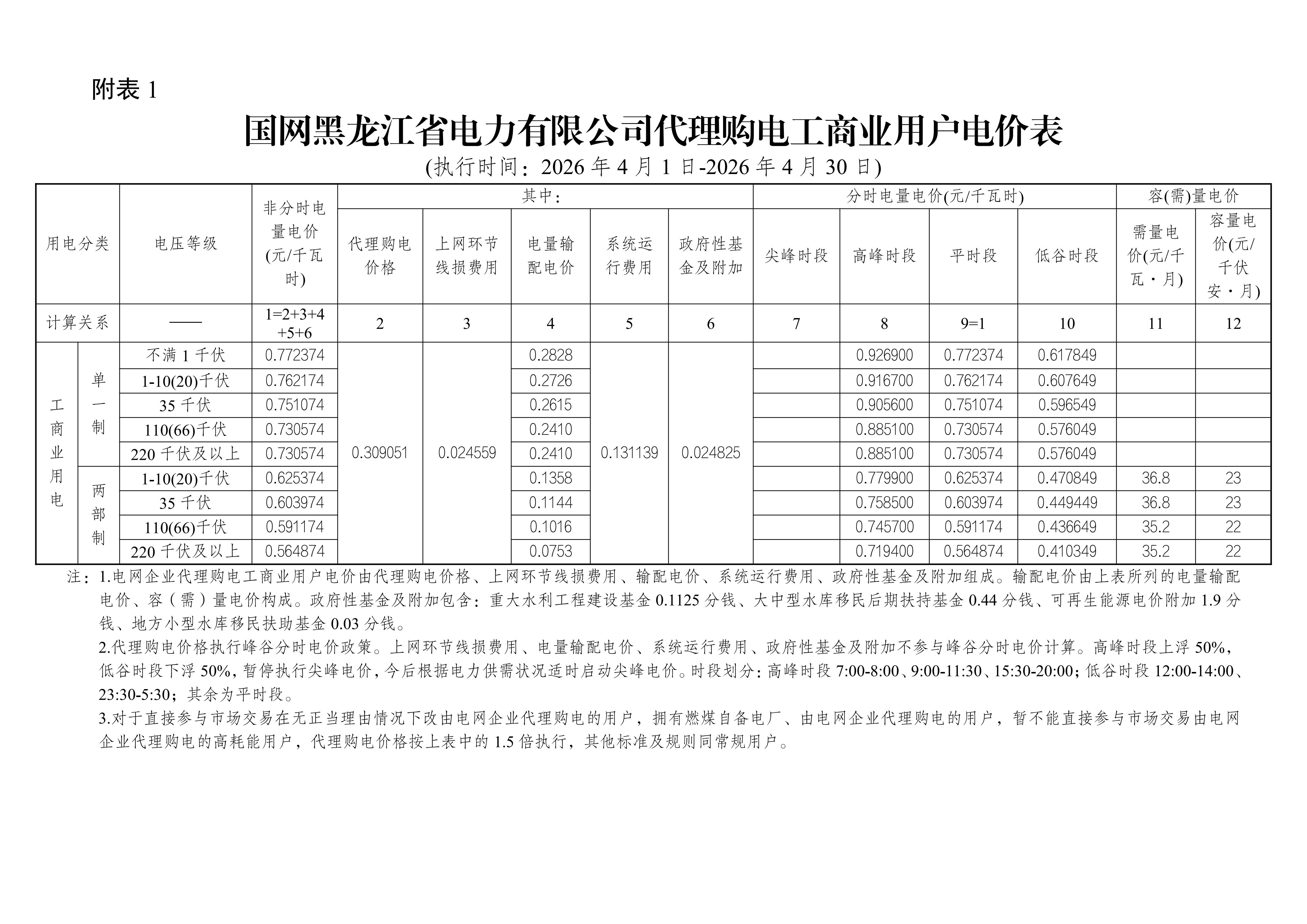 11.黑龙江省4月工商业电价