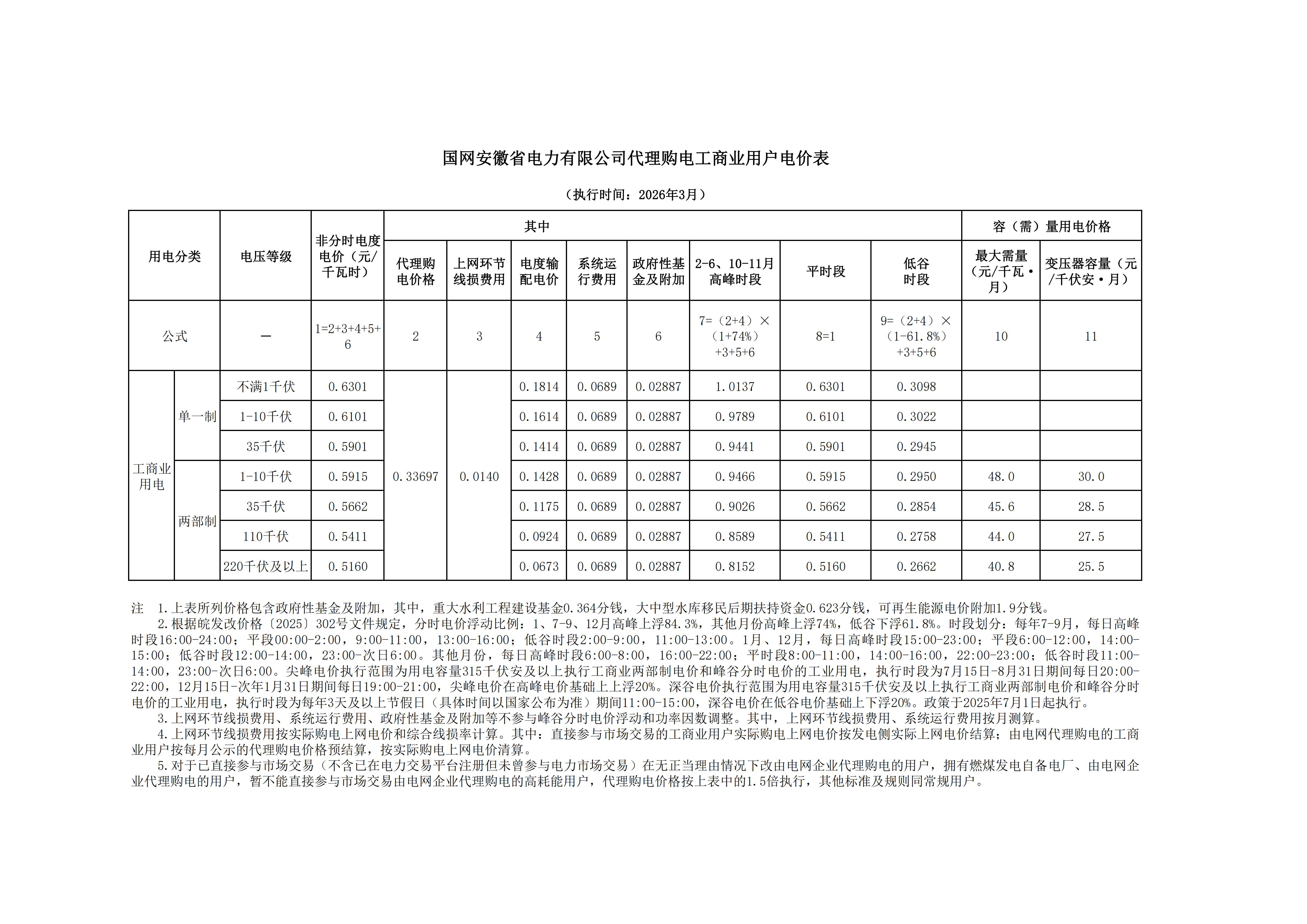 安徽省3月工商业电价