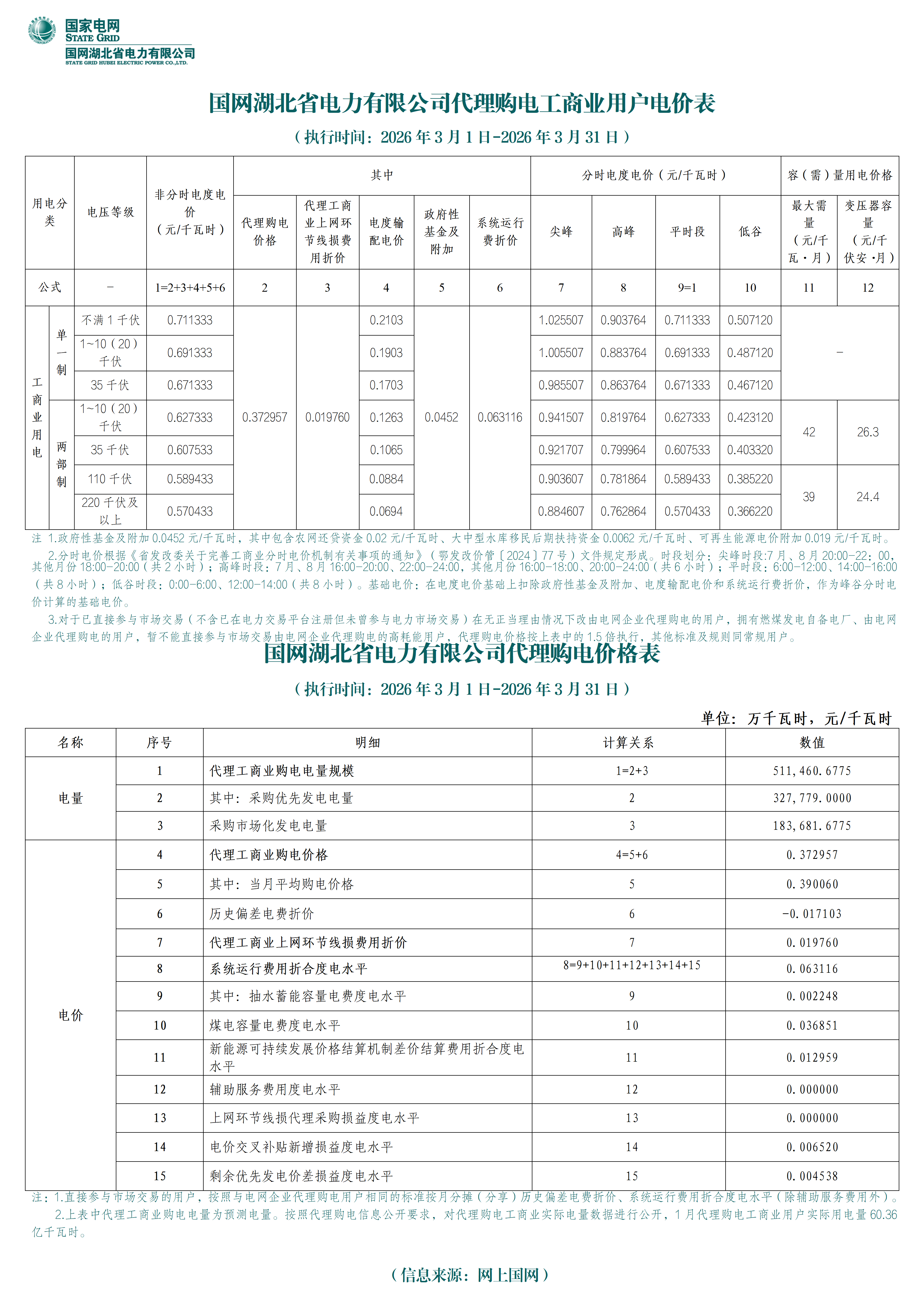 湖北省3月工商业电价