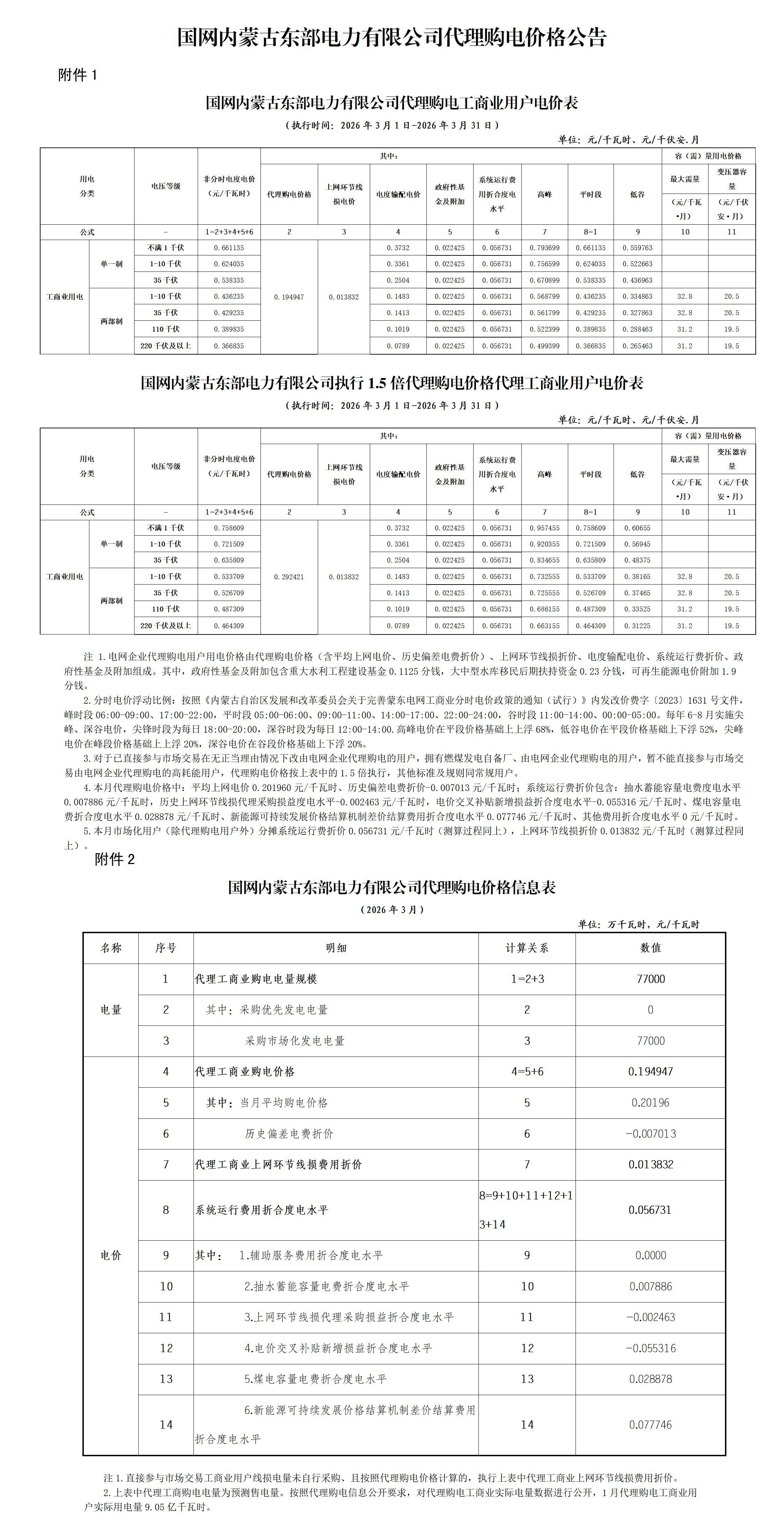 内蒙古3月工商业电价