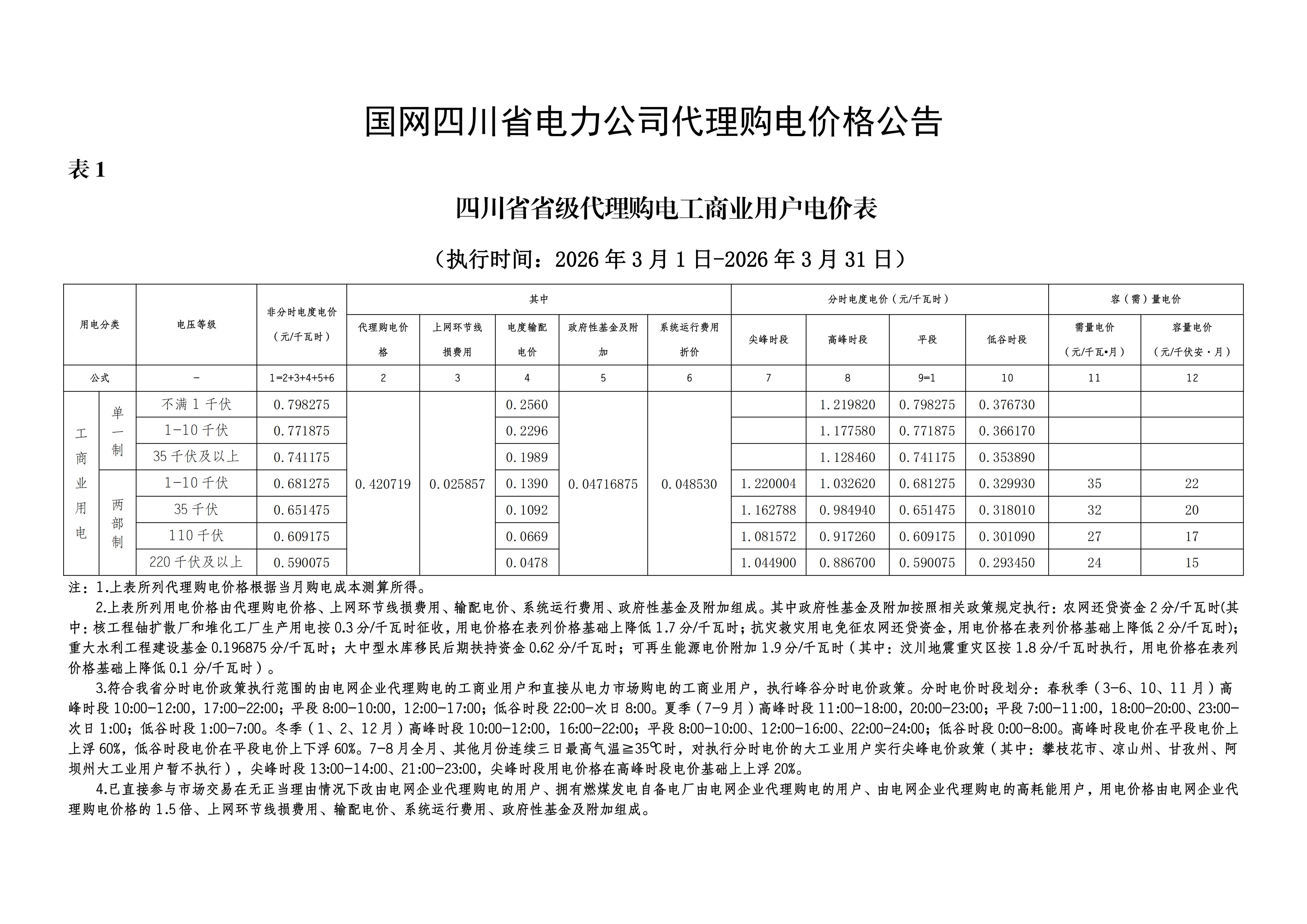 四川省3月工商业电价