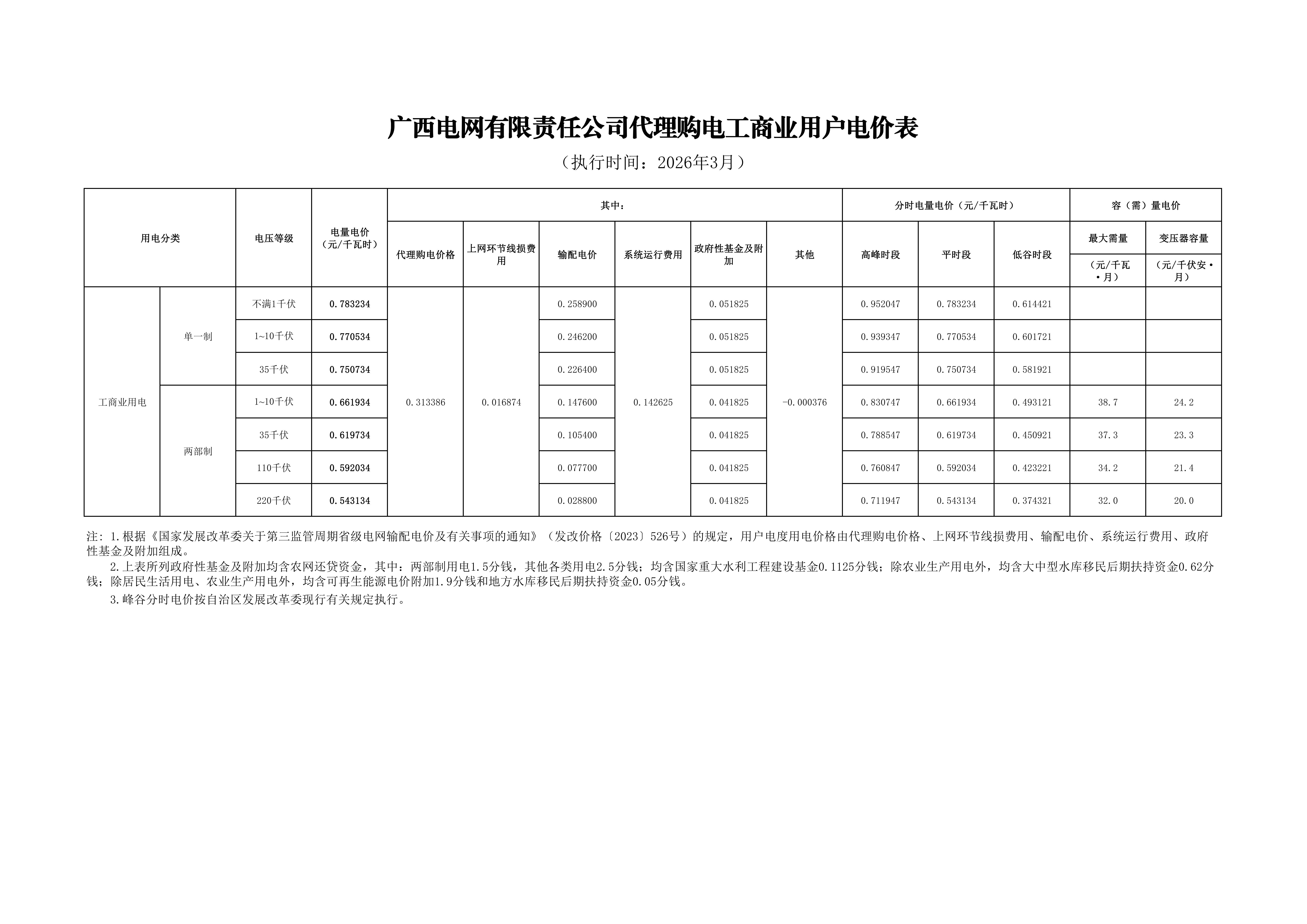 广西3月工商业电价