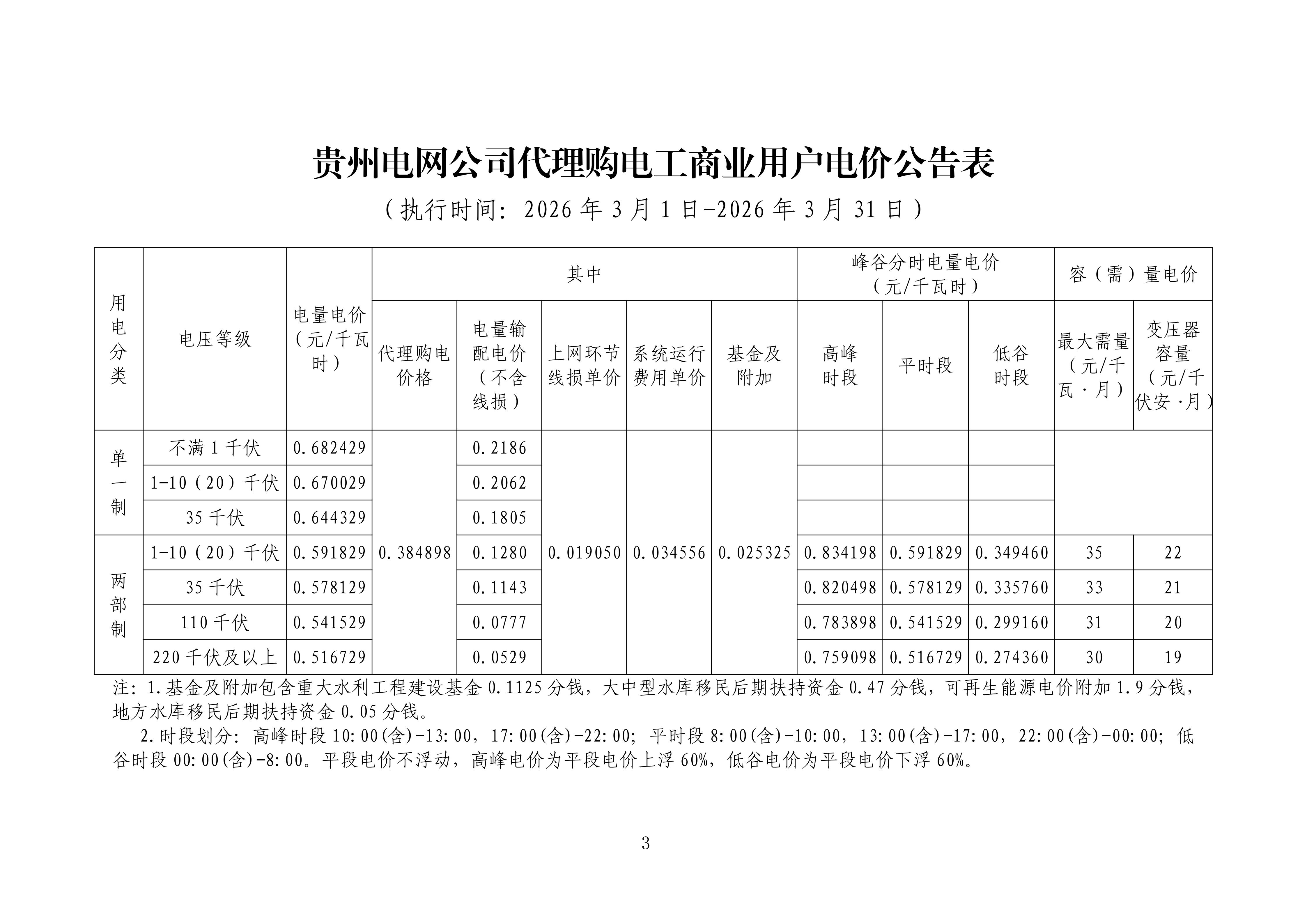 贵州省3月工商业电价