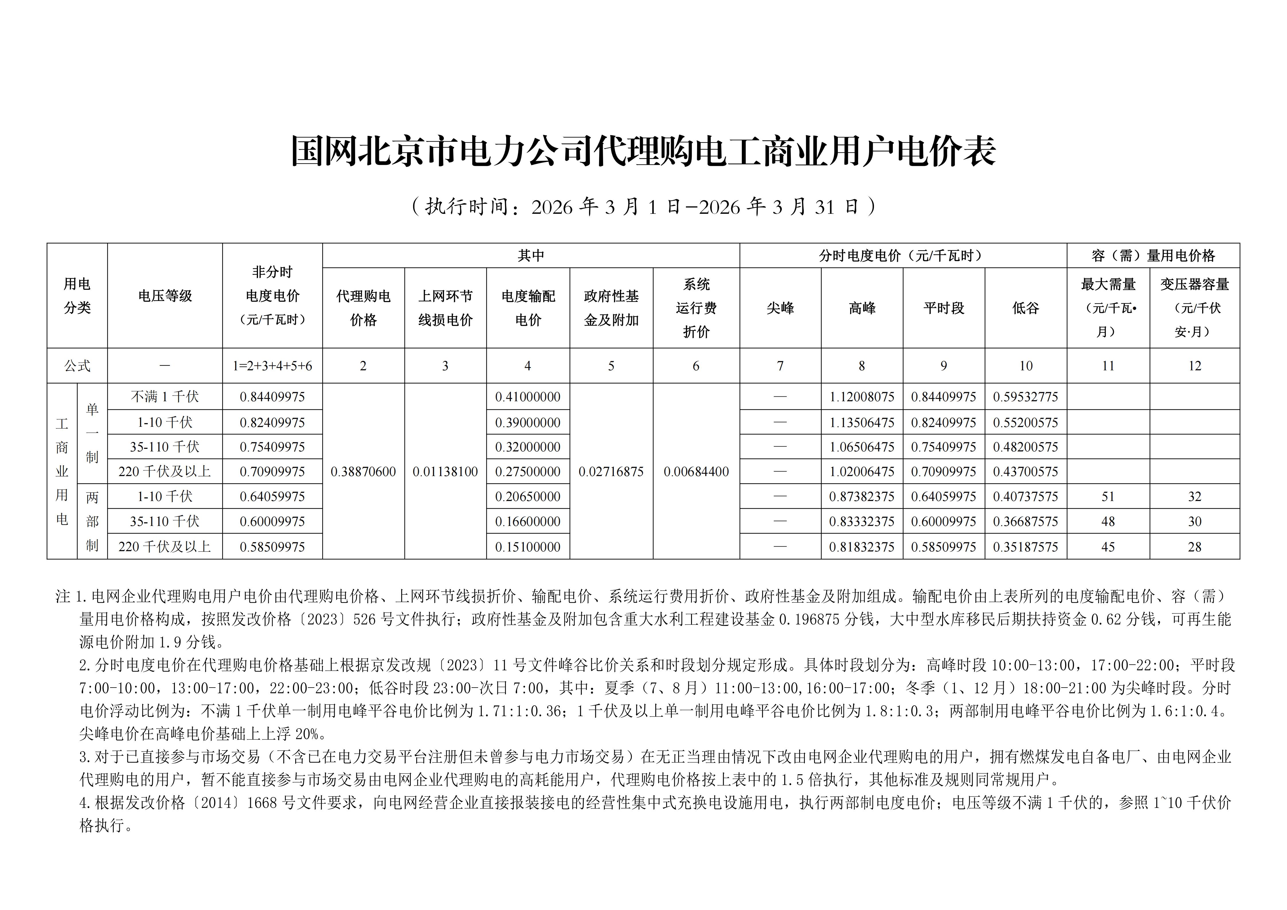 北京3月工商业电价