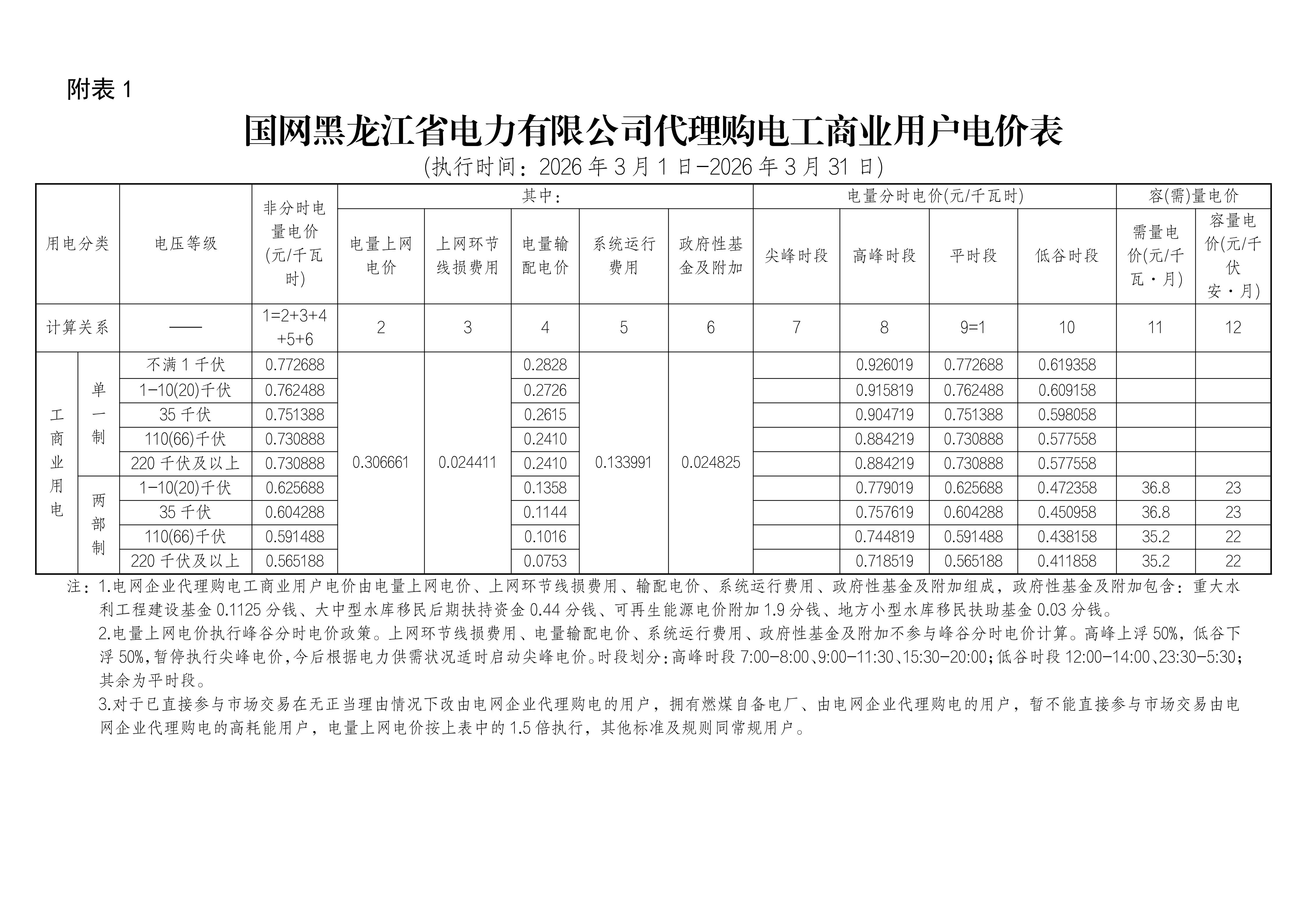 黑龙江省3月工商业电价