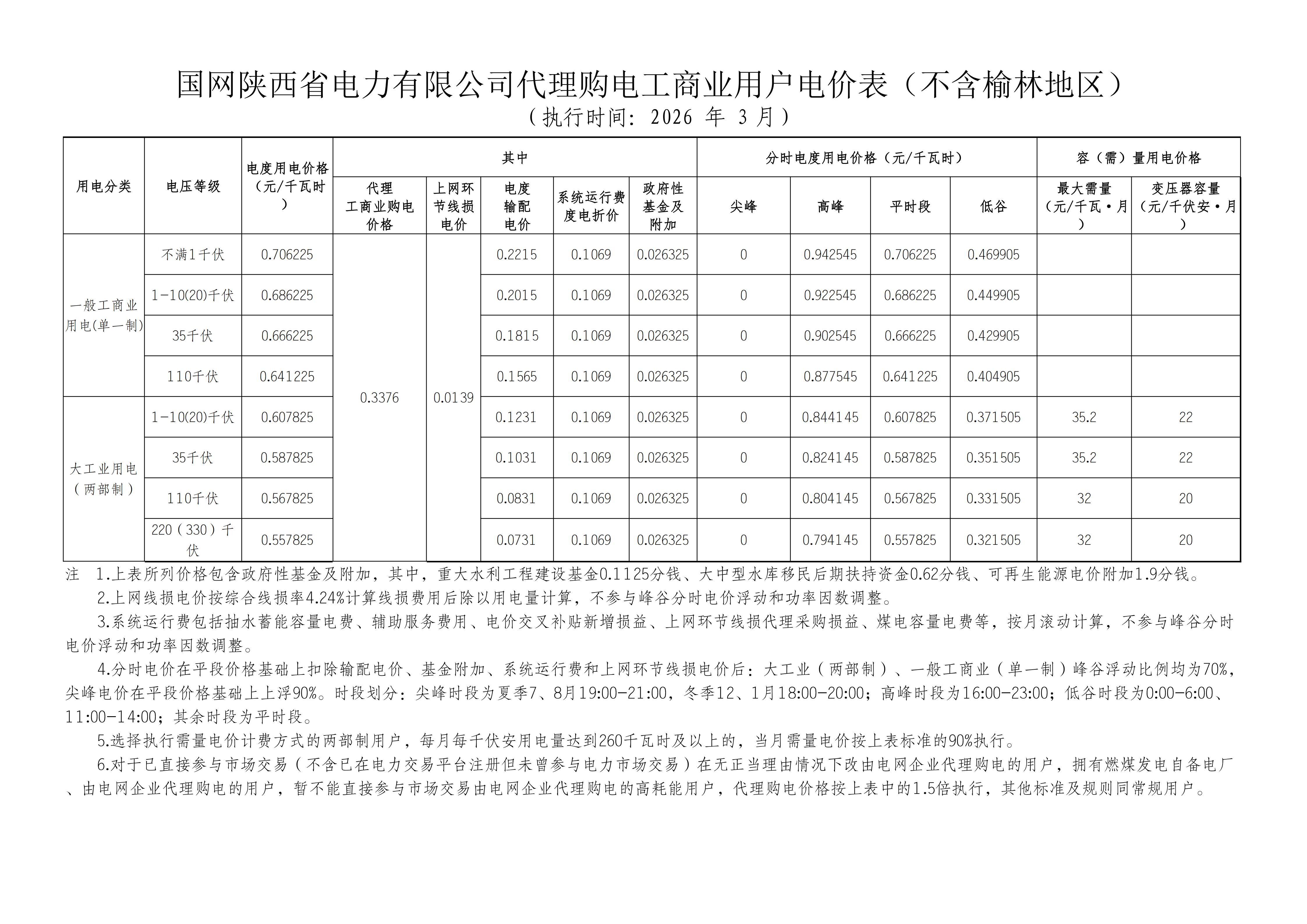 陕西省3月工商业电价