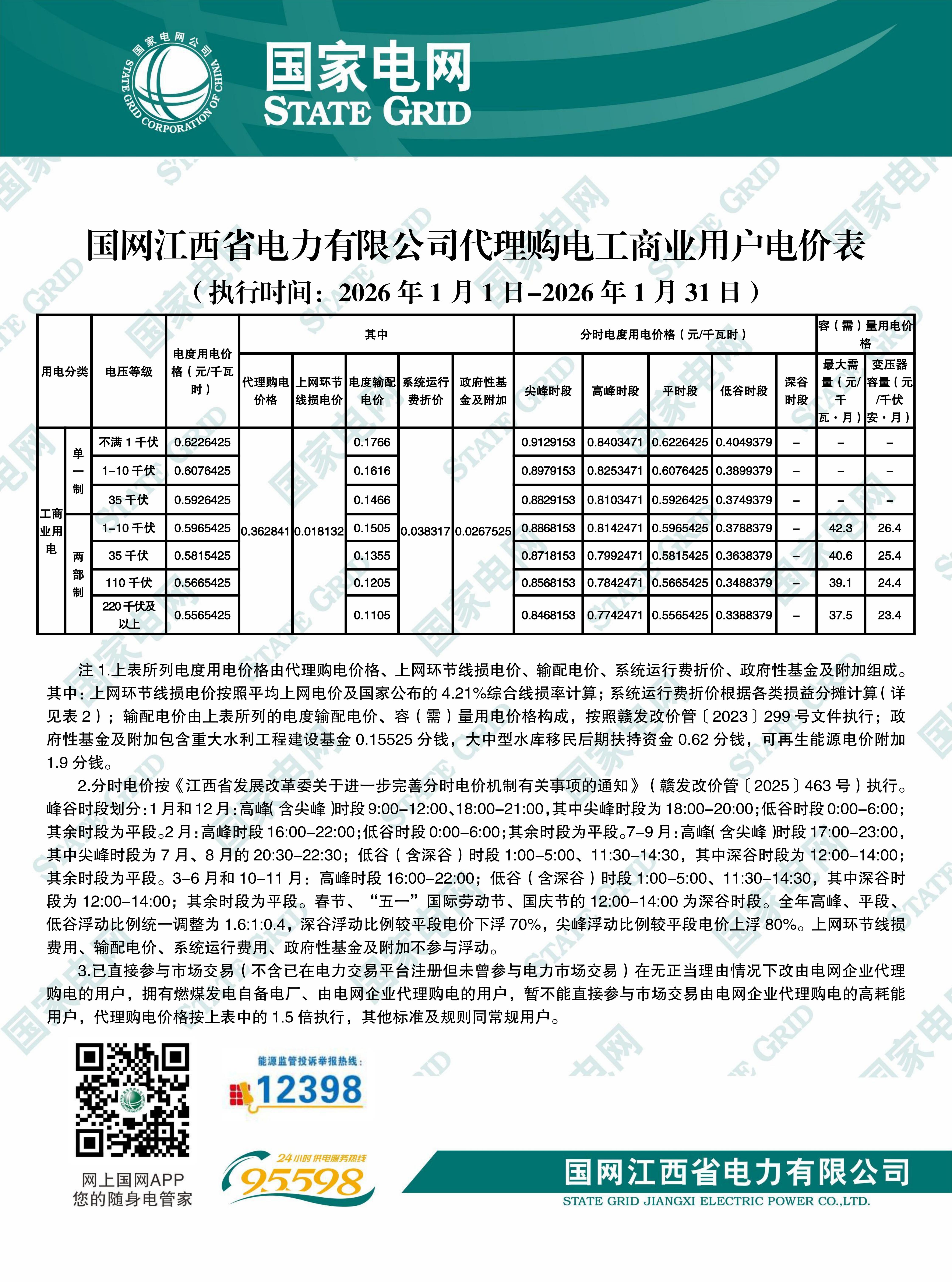 江西省1月工商业电价