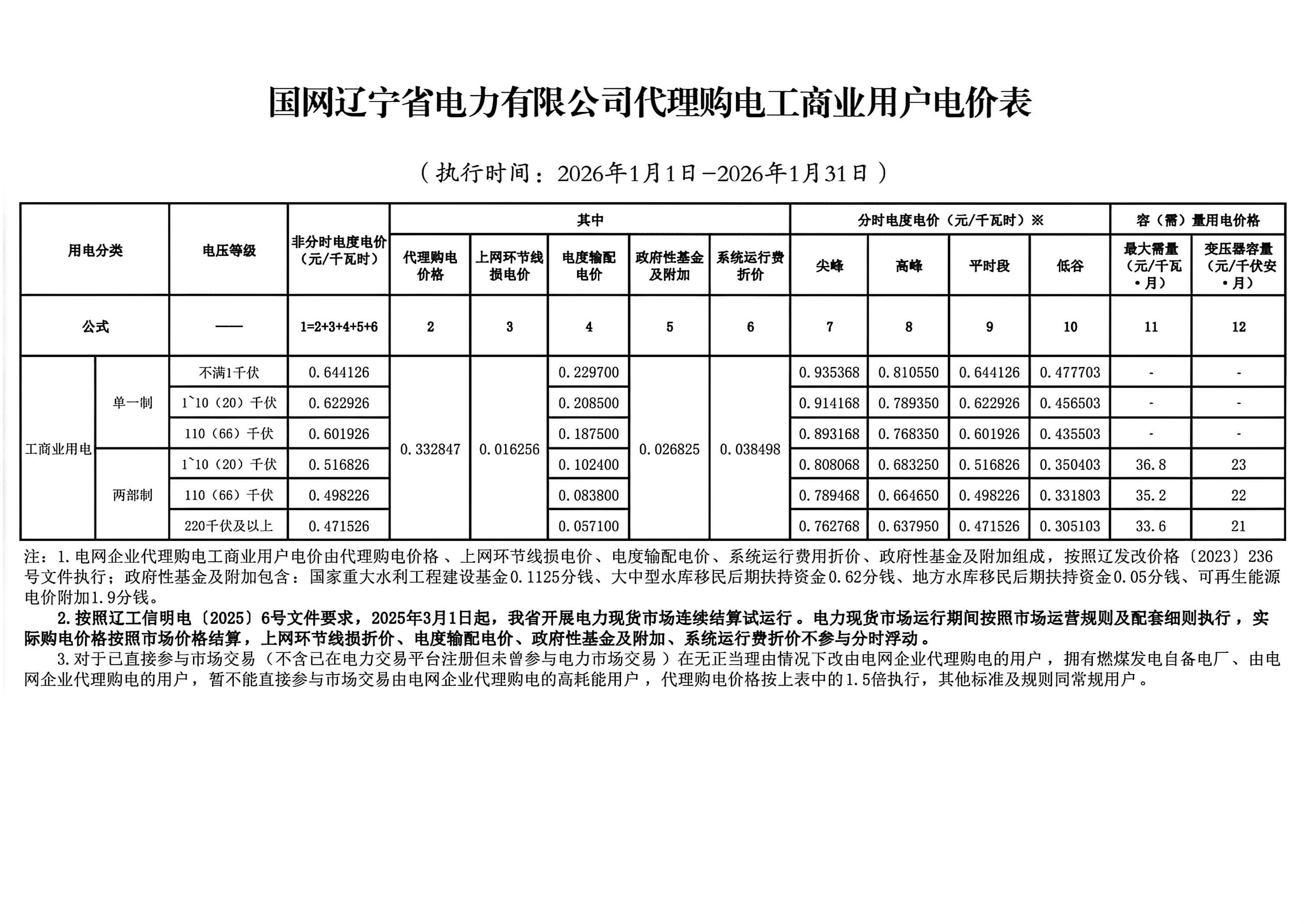 辽宁省1月工商业电价